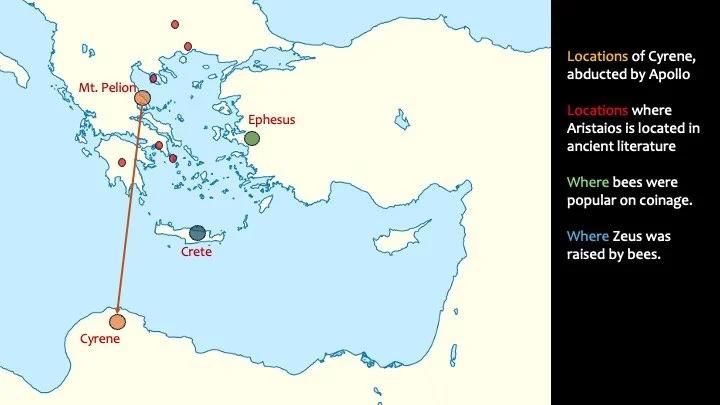 Aristaeus’ role as the god of bees and other important agricultural practice is literally all over the map—unexpectedly since every town and city would want to be attached to this important god. Here is a map of the important places mentioned in the podcast, as well as other locations of importance.