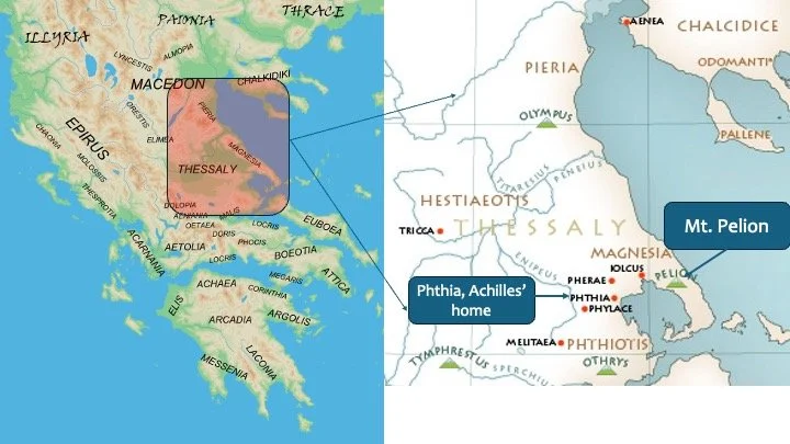 In this episode we treat the hero Achilles outside the Iliad: his parentage, his mother’s attempt to make him immortal (or hide him), and his youth under the guidance of Chiron. We thank Emma Swain for conceptualizing the episode and choosing the visual images found on this page. The first thing to focus on is where Achilles was from: Thessaly, an important area in the north on the mainland. Achilles is said to be from “Phthia” (not easy to stay!) and raised on Mt. Pelion by the centaur Achilles.