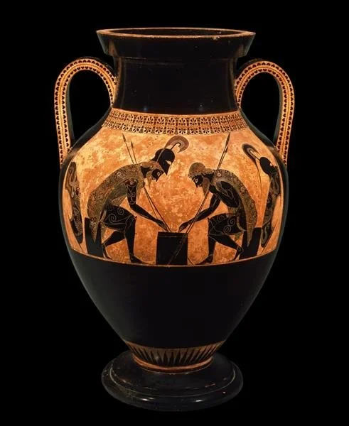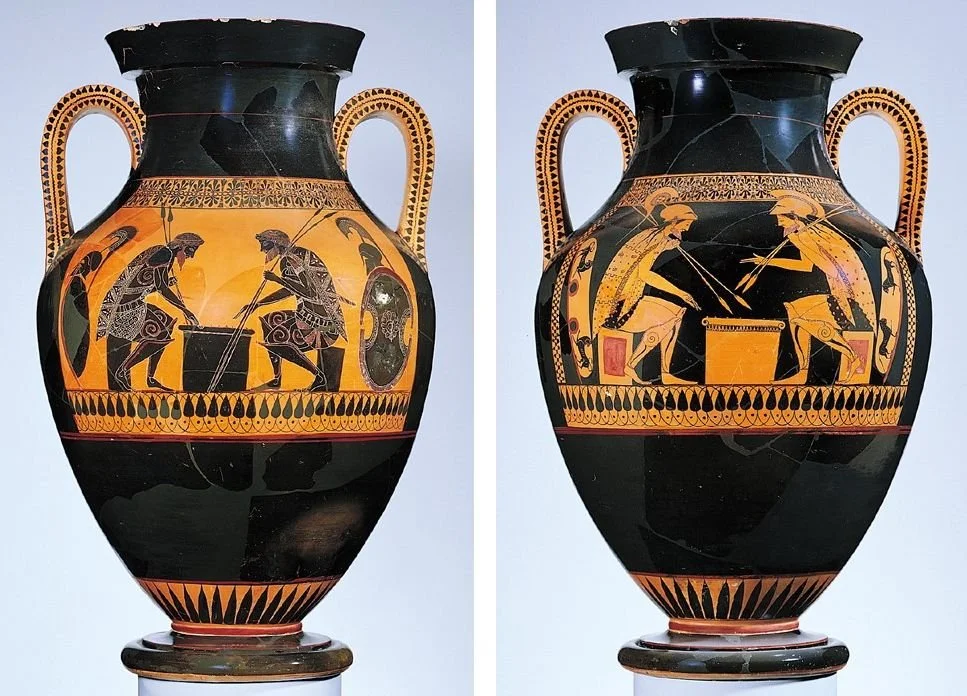 Achilles and Ajax son of Telamon play a board game in the interstices of the Trojan War.
